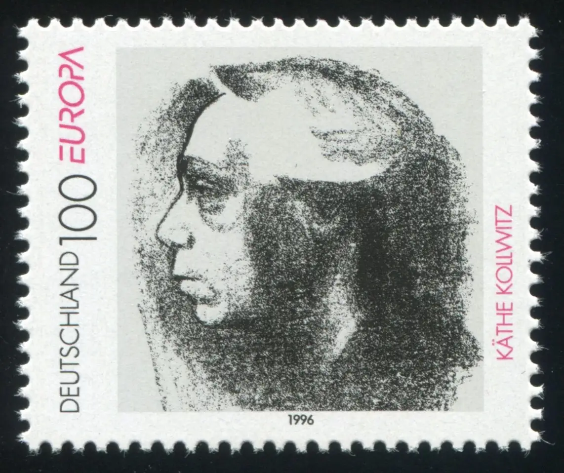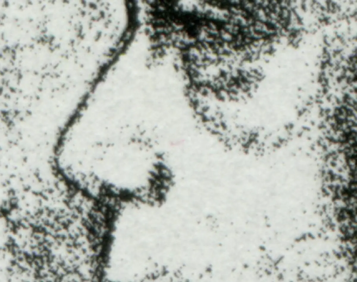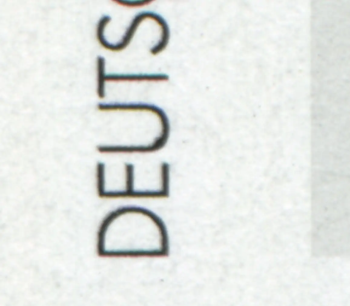 Doppel-Plattenfehler auf Feld 6: Verdickung im U von DEUTSCHLAND und roter Strich rechts von der Nase im Gesicht