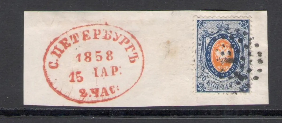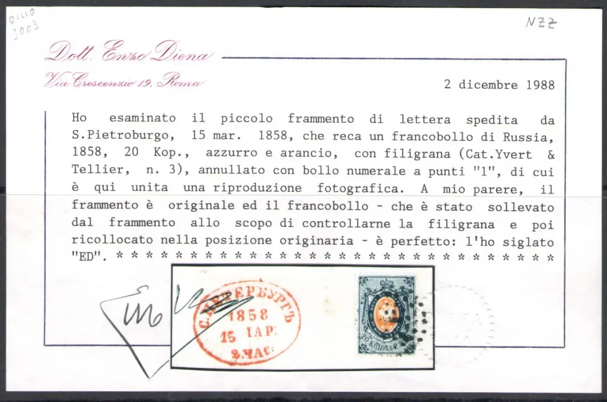 1858 RUSSLAND, Yvert- und Tellier-Katalog Nr. 3 - 20 Blaue und Orange Kopeken - Kleines gebrauchtes Brieffragment - Diena-Zertifikat - Kleines Brieffragment, verschickt aus St. Petersburg, gestempelt mit der Nummer '1' - die Briefmarke wurde zur Überprüfung des Wasserzeichens abgetrennt, vom Sachverständigen signiert und neu positioniert.