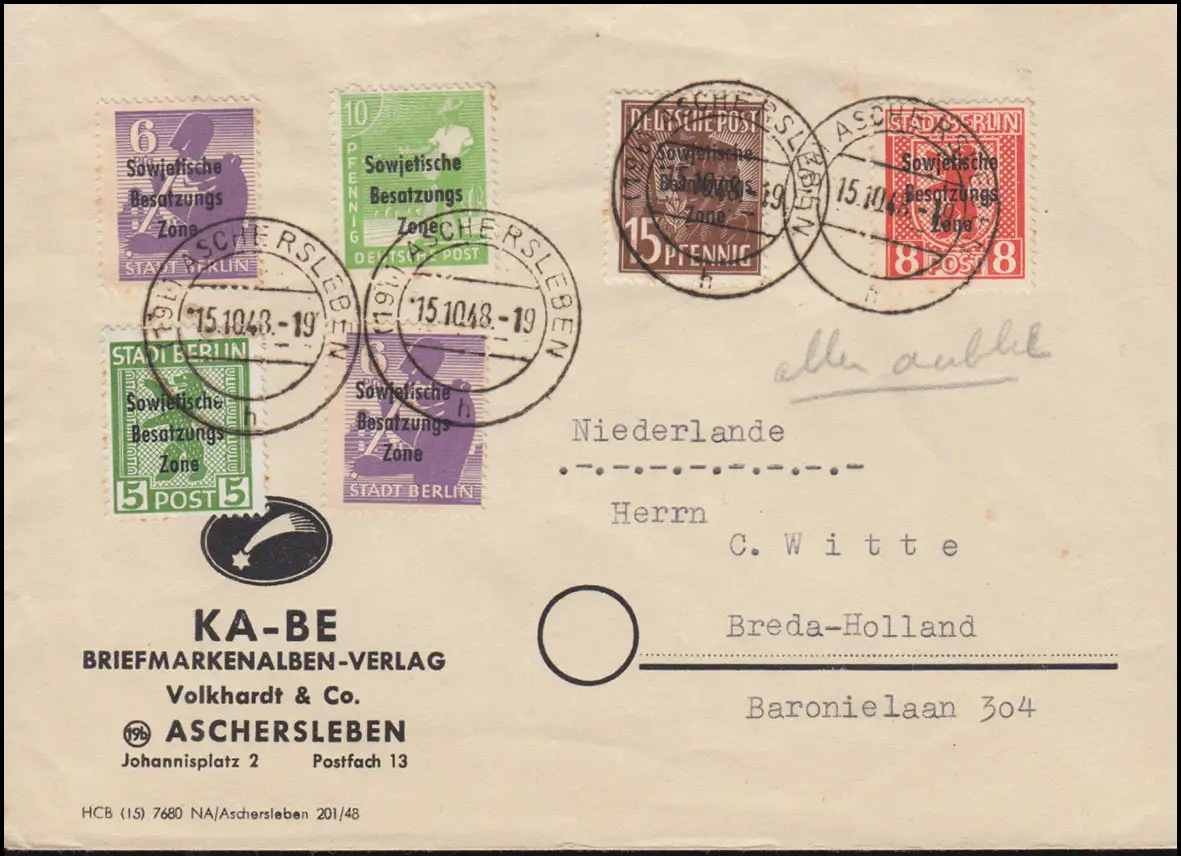 portogerechte Mischfrankatur vom KA-BE Briefmarkenalben-Verlag aus Aschersleben auf Auslandsbrief nach Breda / Holland