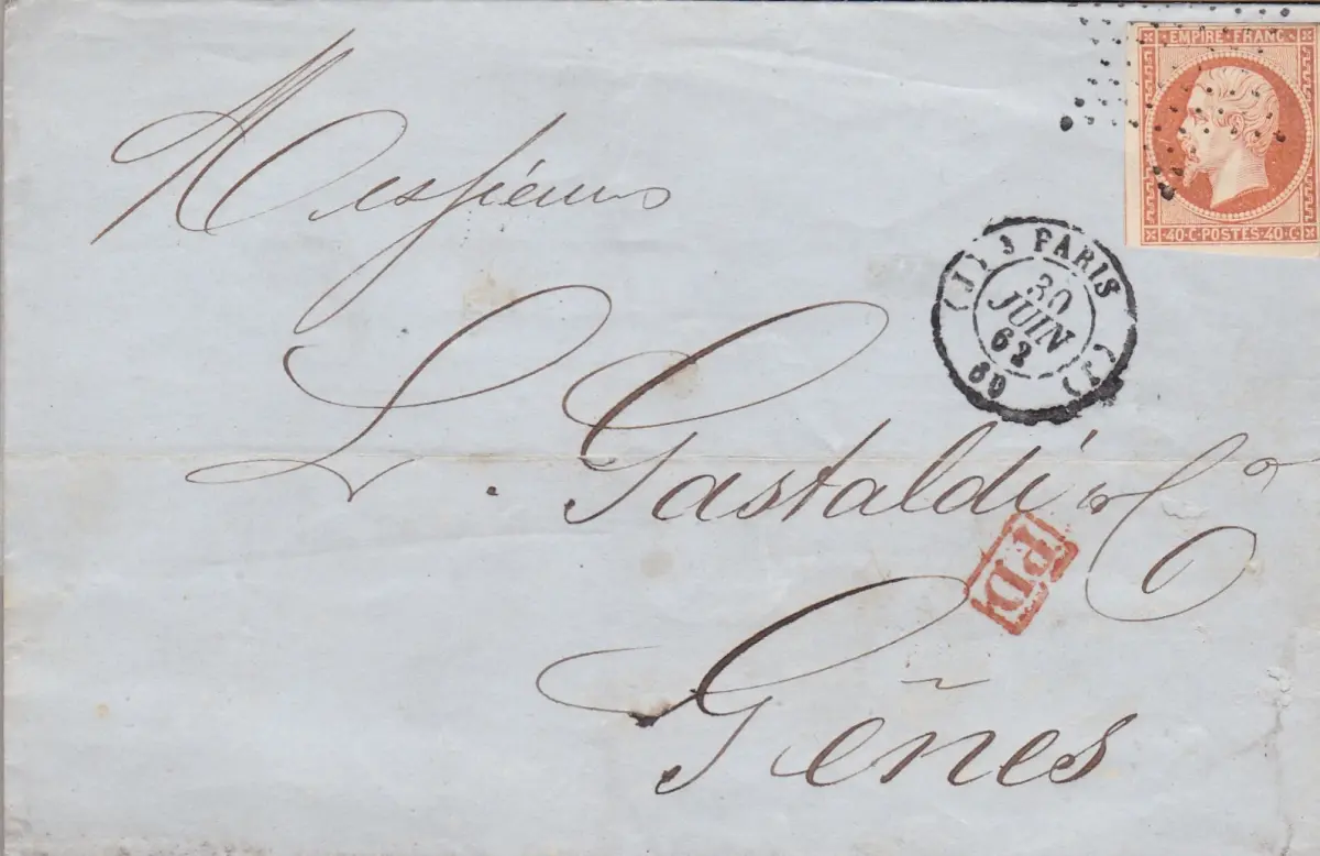 1862 FRANKREICH, 40c. Nr. 16 auf Brief nach Genua mit Sternstempel A/Buchstaben
