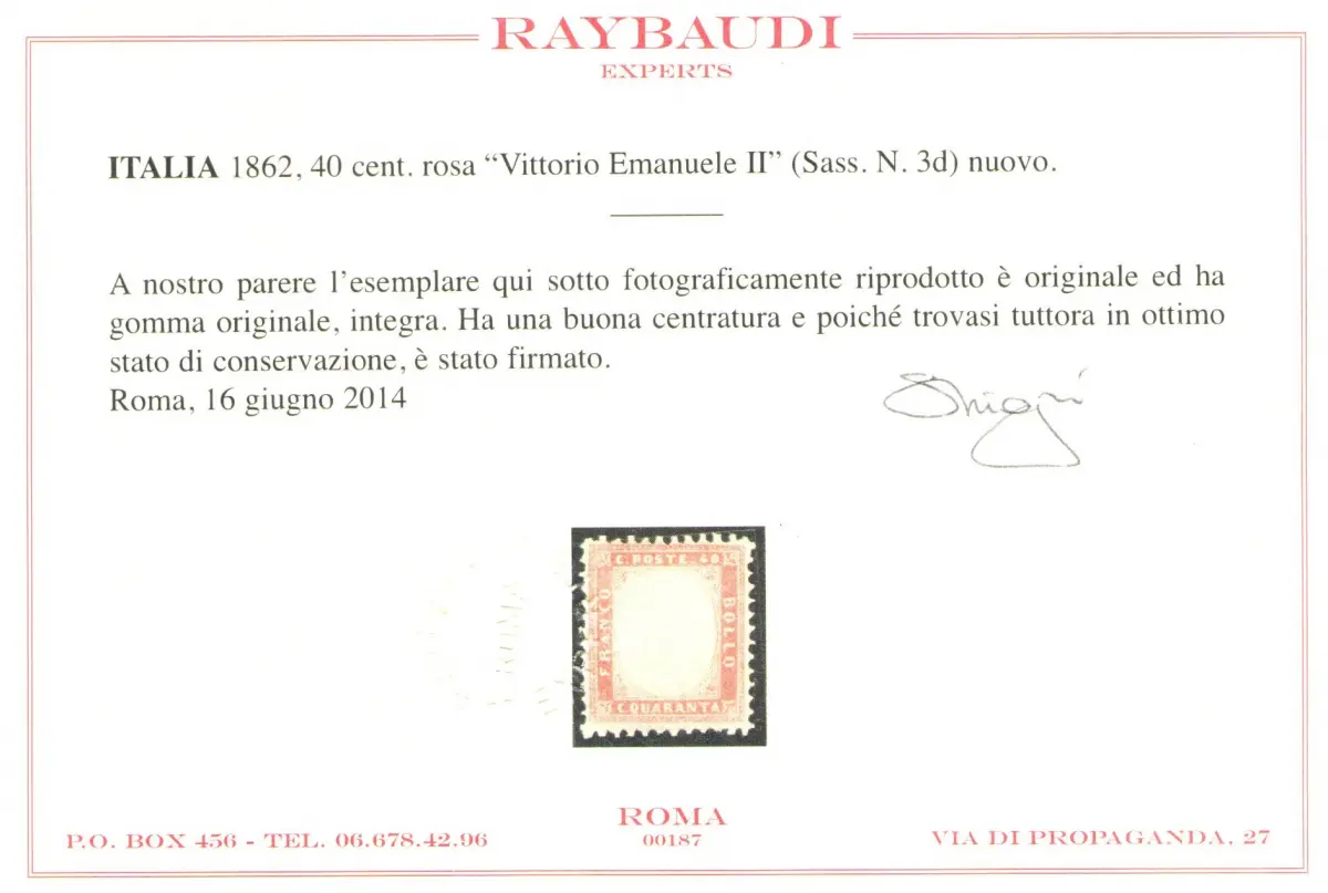1862 Königreich Italien, N 3d, 40 Cent rosa, Zentrierung gut, MNH ** - Raybaudi-Zertifikat Vollgummi und Original - ohne Linguella - Not Hinged Lot Claudio Sächsischer Katalog Nr. 3D Euro 1250 - ROTE BOX AUSSEN