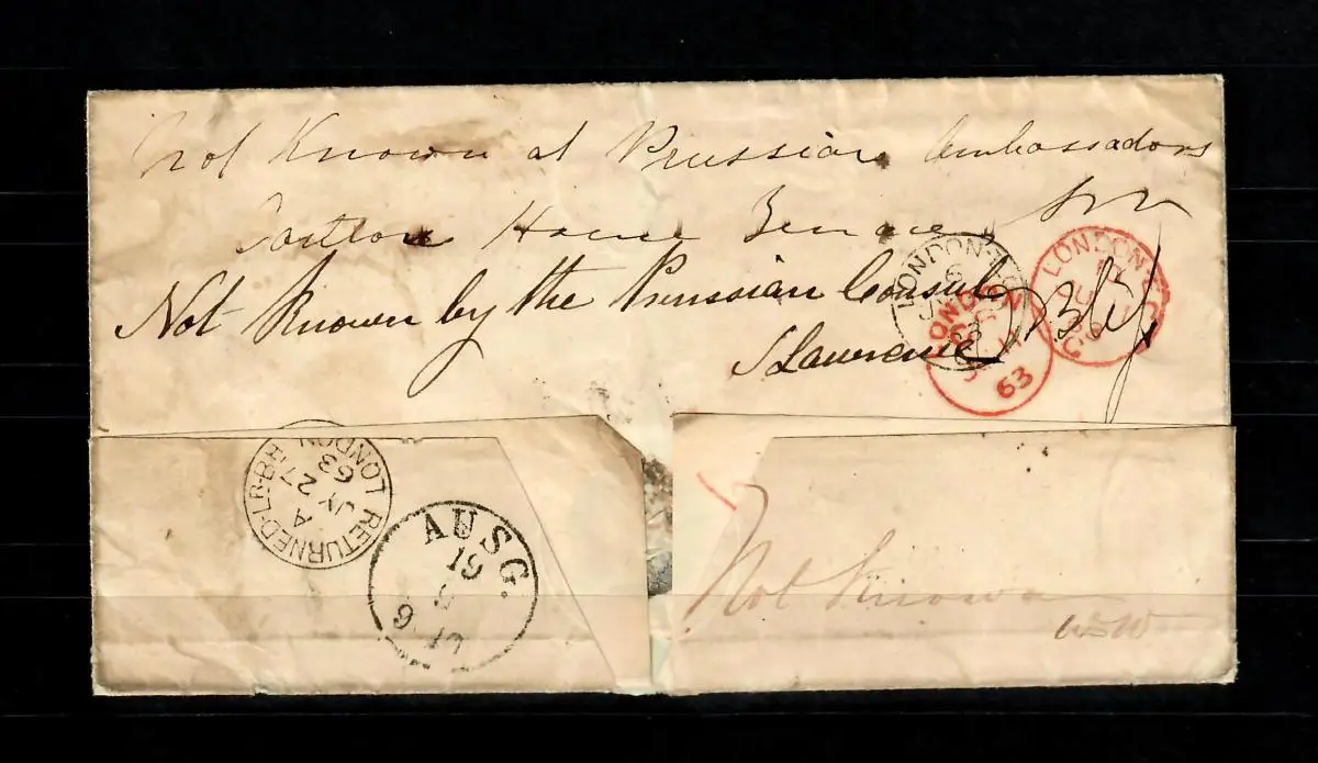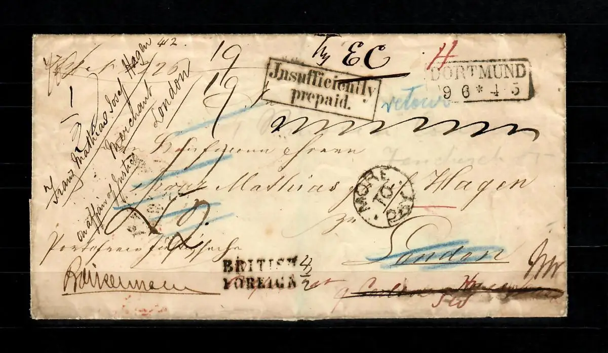 1863: Envelope stampless from Dortmund to London, redirected tax remarks, fine