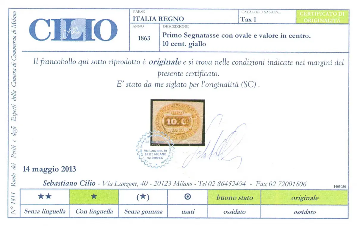 1863 Königreich Italien, Steuermarken Nr. 1 MLH * ORIGINALGUMMI MIT OVALER Linguella mit Wert in der Mitte und horizontalen Beschriftungen, 10 Cent.
