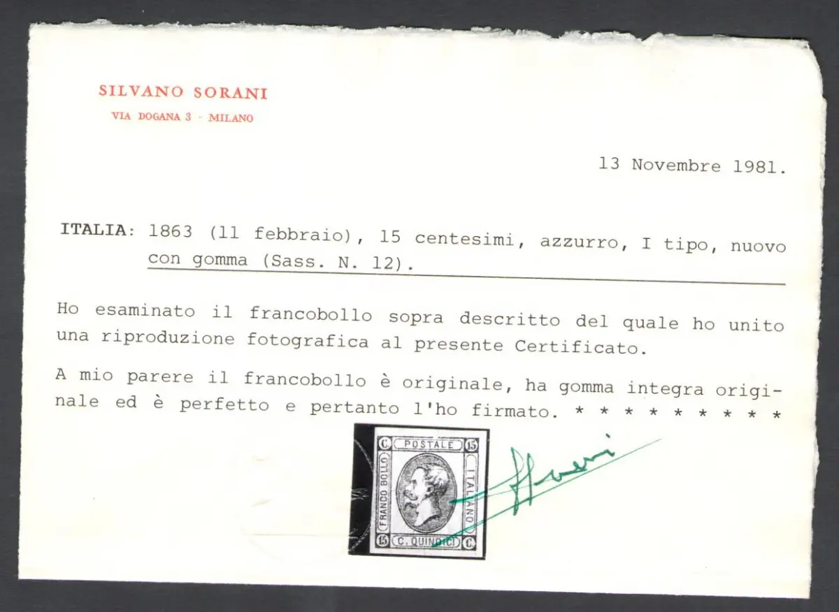 1863 Königreich Italien, Bildnis von Vittorio Emanuele II Nr. 12, Druck in Lithographie, MNH ** - Zertifikat Sorani Vollgummi und Original - ohne Linguella - Not Hinged Lot Claudio rote Box Sächsischer Katalog Nr. 12 Euro 1500 - ROTE BOX AUSSEN