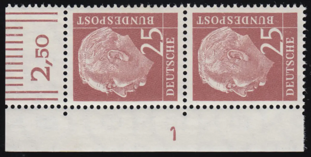 186xw Heuss 25 Pf Eckrandpaar mit Druckerzeichen DZ 1 positiv, ungefaltet, **