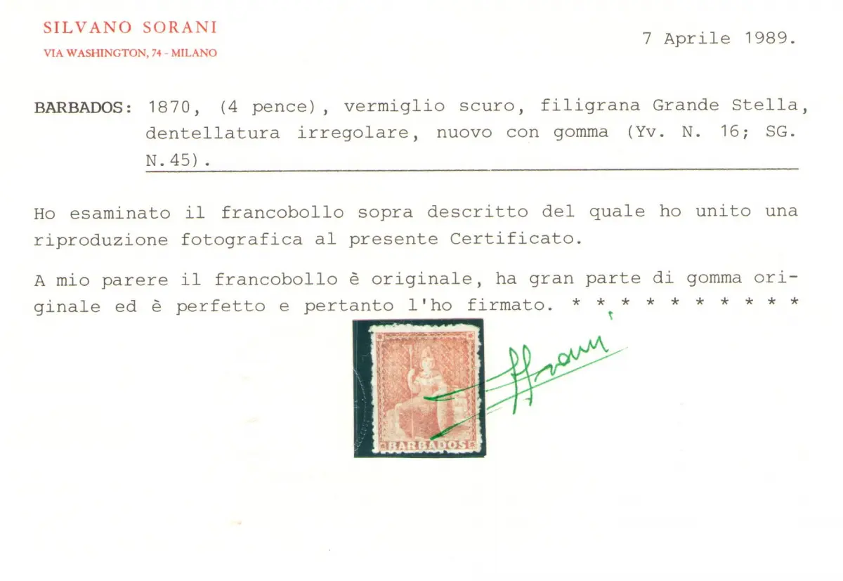 1870-71 Barbados - Stanley Gibbons Nr. 4d. dull vermilion - MH* Sorani Zertifikat hat viel Originalgummi - Filigraner großer Stern unregelmäßige Verzahnung Stanley Gibbons 1600 - Auslandsbox Englische Kolonien