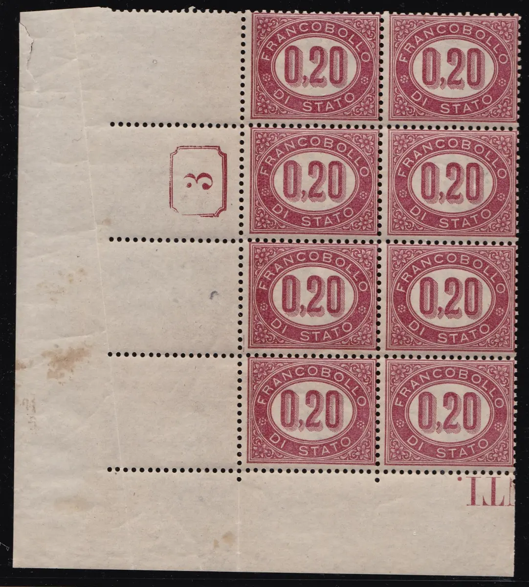 1875 ITALIEN - KÖNIGREICH, Service Nr. 3 MNH/** TISCHNUMMER 3 IM RECHTECK Wertziffer in einem Oval, Block mit 8 sächsischen Bogenrand Euro 375 Lot 83