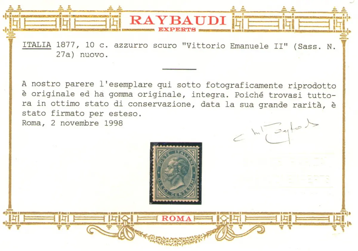 1877 Königreich Italien - 10 Cent hellblau, Nr. 27a, Abbild von Vittorio Emanuele II, MNH**, Raybaudi Expertise Certificate for Grani Rarità