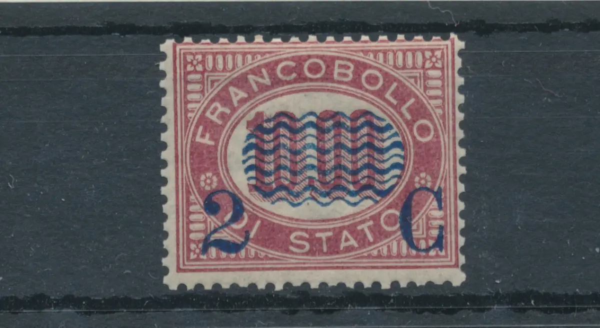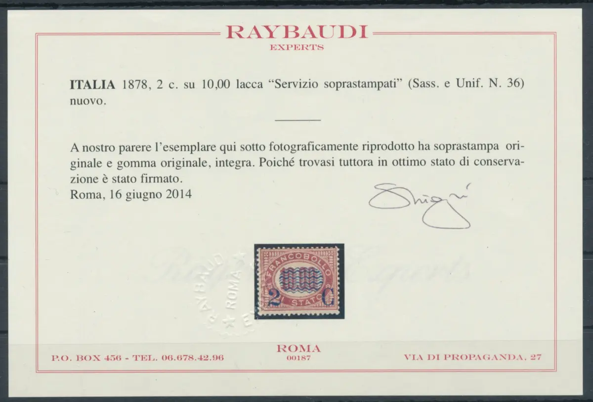 1878 Italien - Königreich, Nr. 36 - 2 Cent. auf 10,00 Lack, Service überdruckt, postfrisch** - Raybaudi Zertifikat Dienstmarken von 1875 mit blauem Aufdruck Sächsischer Katalog Euro 2.250 - weißer Karton Haus - dezente Zentrierung