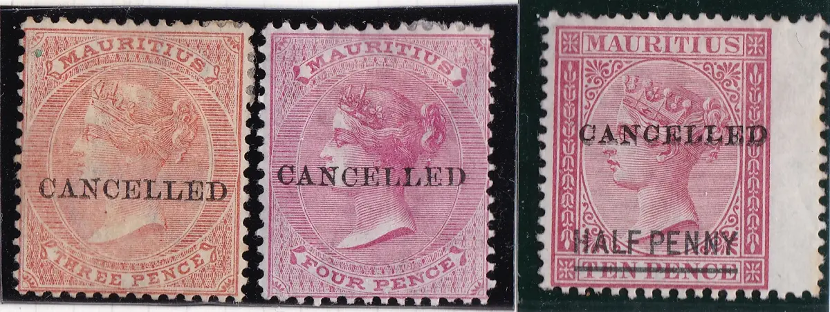 1878 MAURITIUS, SG 61-62-79 Wmk Crown CC 3 Werte überdruckt CANCELLED MH/MLH