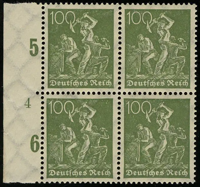 187c Freimarke Arbeiter 100 Pf blassgrün Rand-Viererblock mit Formnummer 4 **