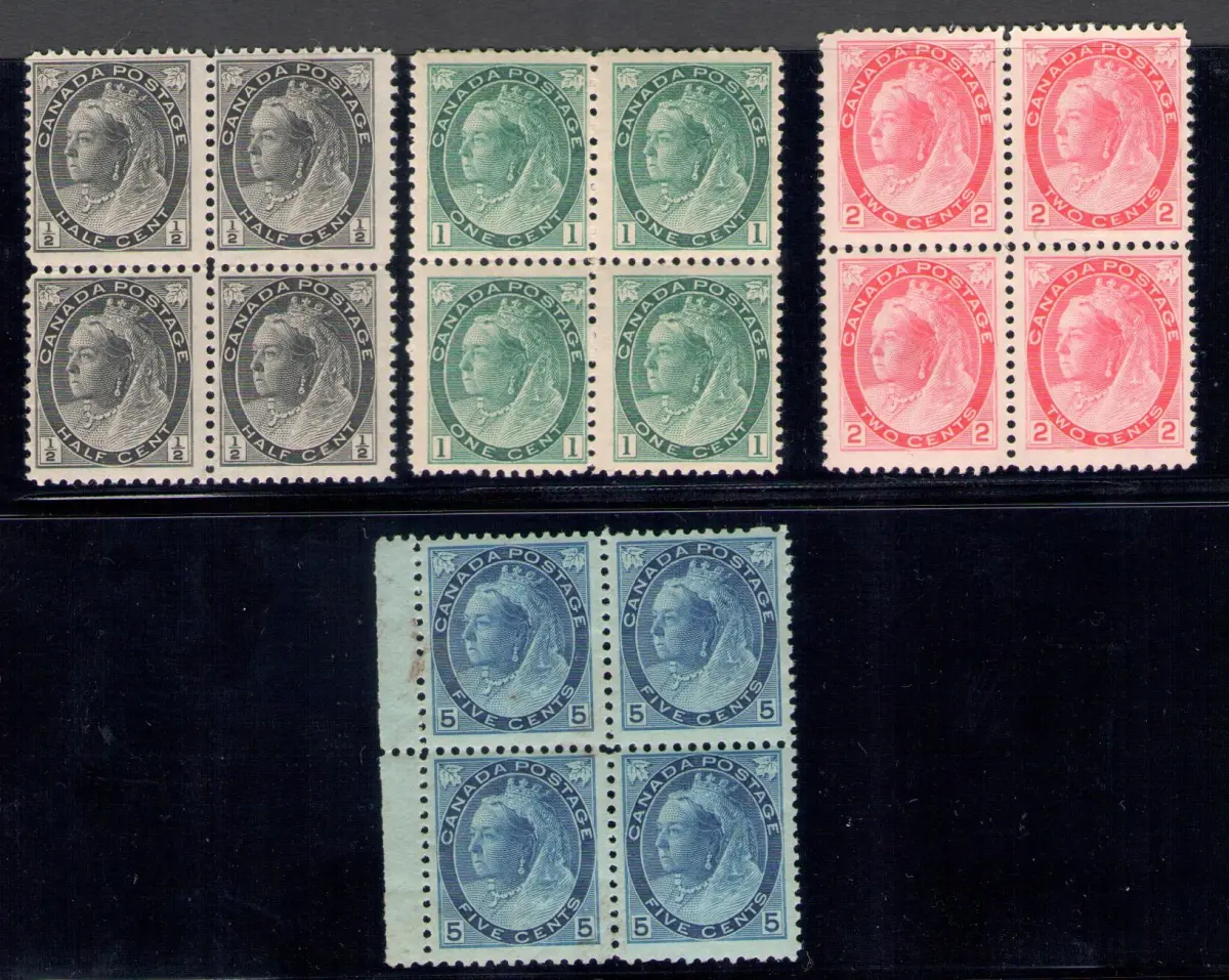 1887-98 KANADA - Queen Victoria - Stanley Gibbson Nr. 141-143-144-146 - 4 Werte MNH ** Viererblöcke (einige Flecken auf der Rückseite im Wert 5 Cent tiefblau wie gescannt) Stanley Gibbons Nr. 141-143-144-146 612+++