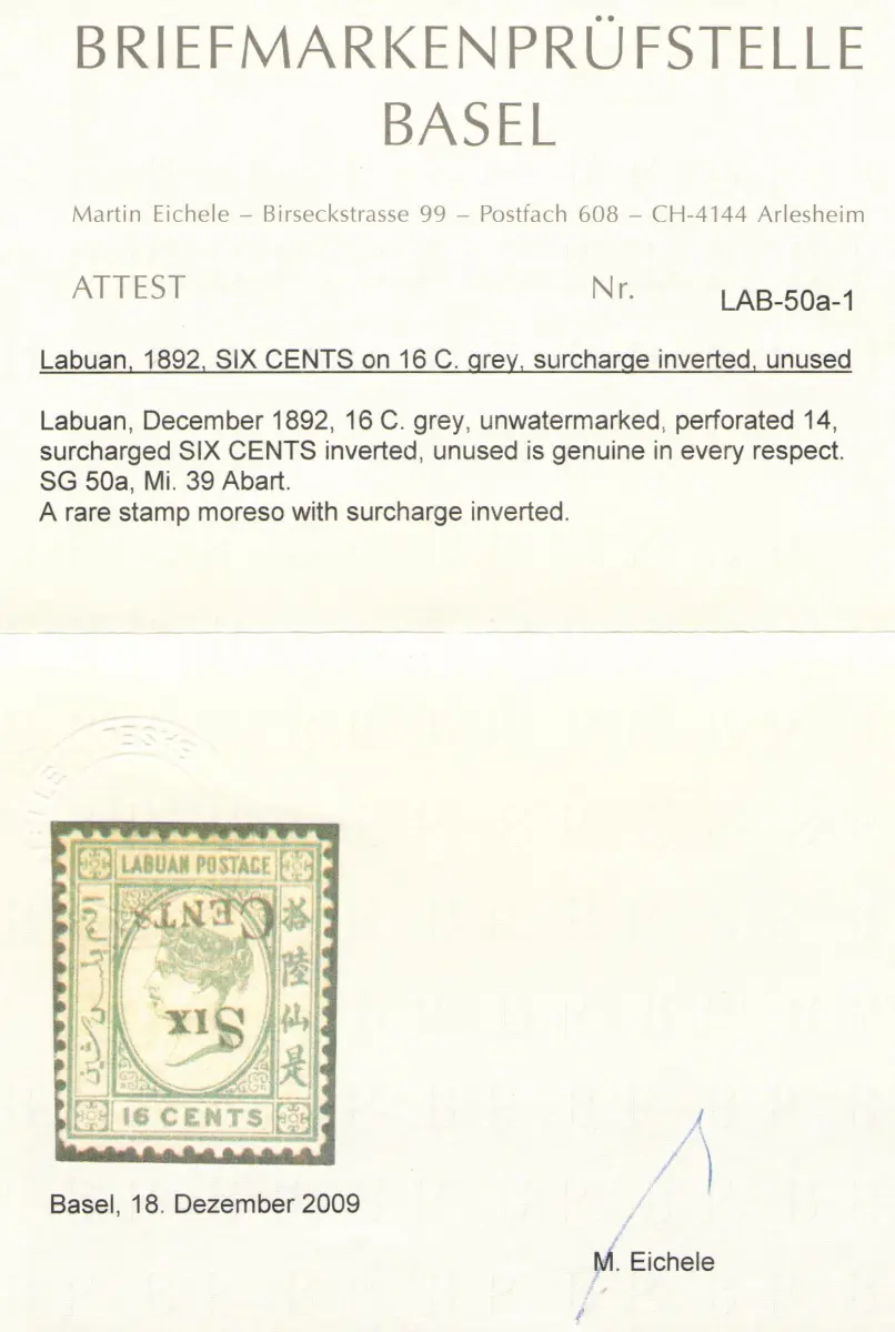 1892 LABUAN - North Borneo - Stanley Gibbson n 50a - 6 cent on 16 cents - Umgekehrter Aufdruck - MH* - Zertifikat Martin Eichele Stanley Gibbons 550 - Auslandsbox Englische Kolonien