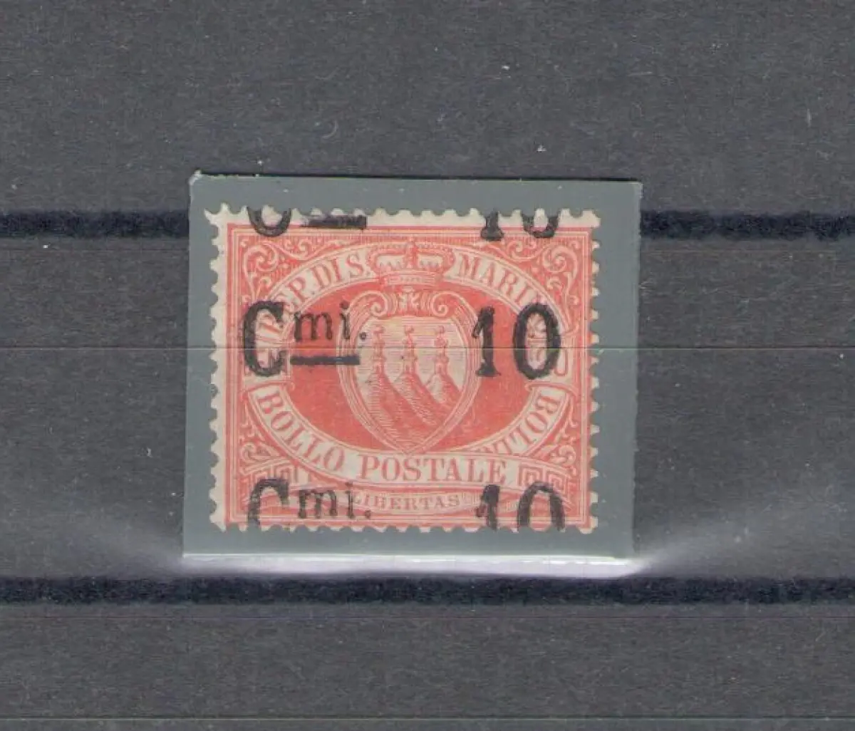 1892 SAN MARINO, Nr. 10, 10 Cent auf 20 Cent rot - Dreifachaufdruck - Zertifikat Chilio - MLH* - Nicht katalogisiert Wie aus dem Zertifikat hervorgeht, hat die Briefmarke einen dreifachen Aufdruck, davon zwei zu Pferd, sehr schön als Sorte, die Briefmarke ist neu und mit Originalgummi, hat eine leichte Spur von Linguella Sächsischer Katalog, NICHT KATALOGISIERT rote Box San Marino Ausland