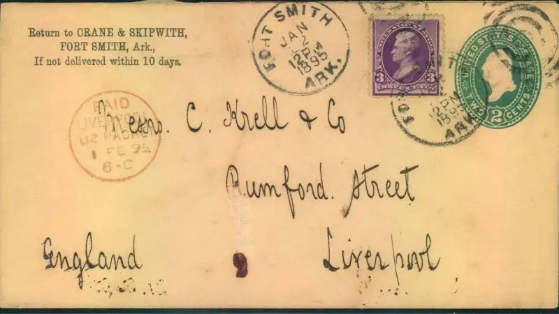 1895, uprated US Stationery envelope from FORT SMITH, Ark. with red "PAID LIVERPOOL US PACKET 1-FEB-8"