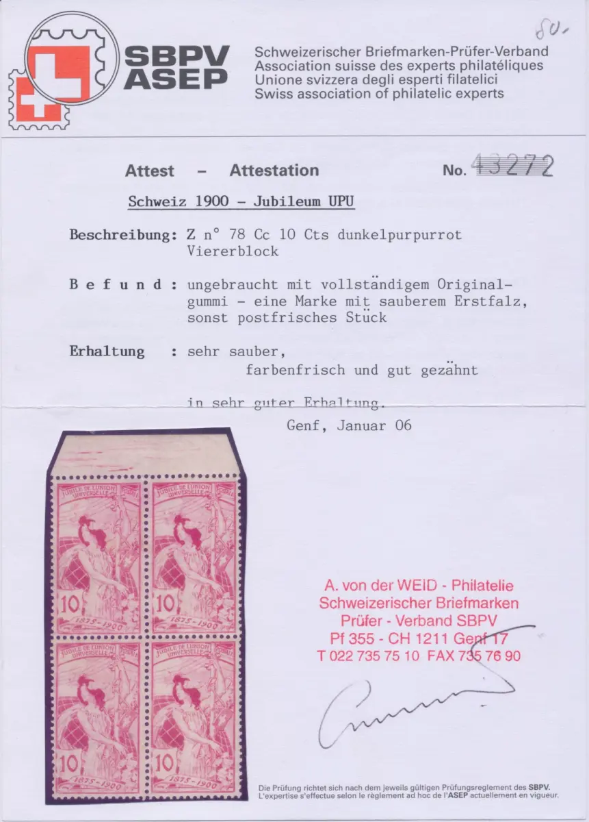 1900 SCHWEIZ - 25. Weltpostverein ** VOLLGUMMI Zumstein Katalog Nr. 78 cc 10 cent. dunkelpurpurrot (sehr seltene Farbe) Zertifikat Von der Weid A / Schweizer Lot Regalblau + 1 A / Leuc Rotes Album