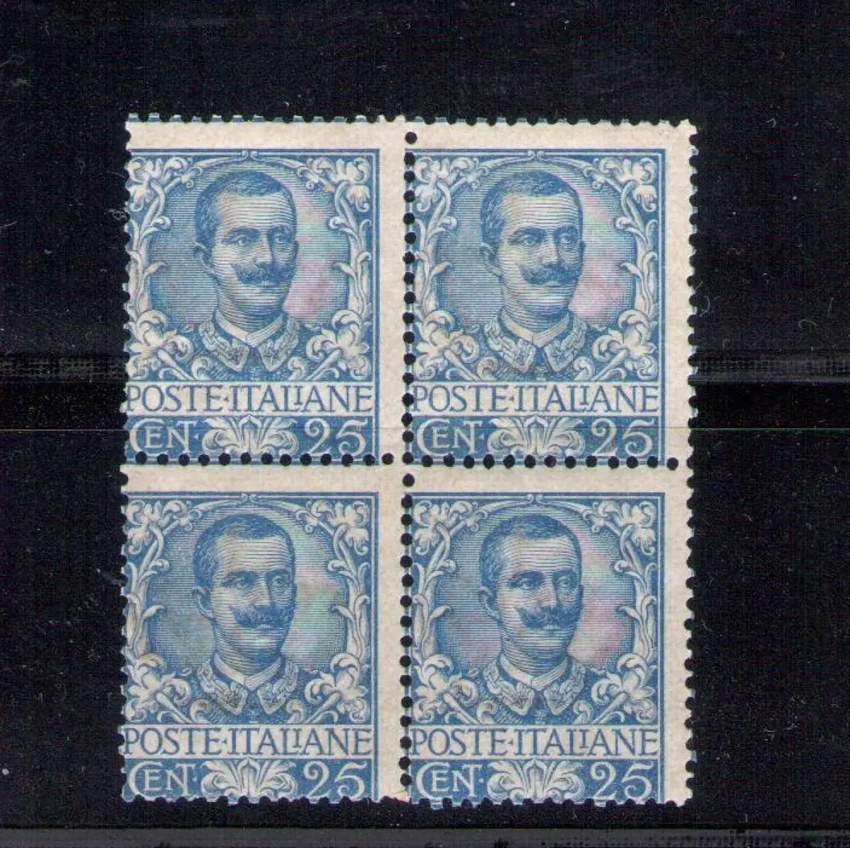 1901 KÖNIGREICH - Vittorio Emanuele III - 25 Cent Floral im Viererblock, mittelmäßige Zentrierung, Nr. 73 MNH ** Garantiezertifikat Philatelie De Simoni Album Königreich Rand Katze Sachsen Euro 1400++