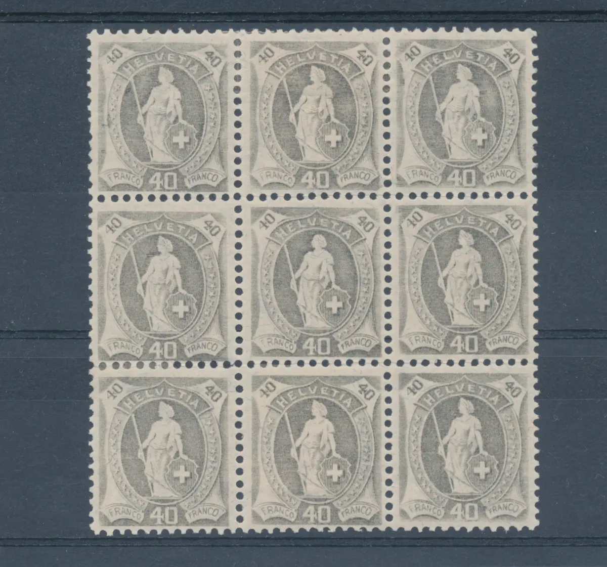 1907 SCHWEIZ - Schweiz zu Fuß - 40 Cent grau, 11 x 11 gezähnt, 9er Block mit Briefmarke ohne Diadem, 'Ohne Diadem' postfrisch** - 3 Marken mit Vollgummi und Original und 6 Marken mit Linguella-Spur - die Briefmarke ohne Stirnband ist MNH** - ORIGINAL & VOLLGUMMI Zumstein 96B Euro 1370 9er Block A / Lot Schweiz Leuccht rot groß