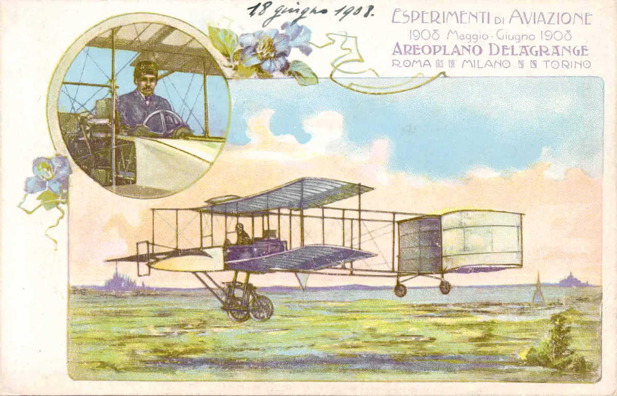 C - 1908 Erste Luftfahrtexperimente in Italien - Polychrome Postkarte Flugzeug Delagrange (Soc. Anon. Azimonti - Giorgis, Turin) - neu perfekt Cod.113/182