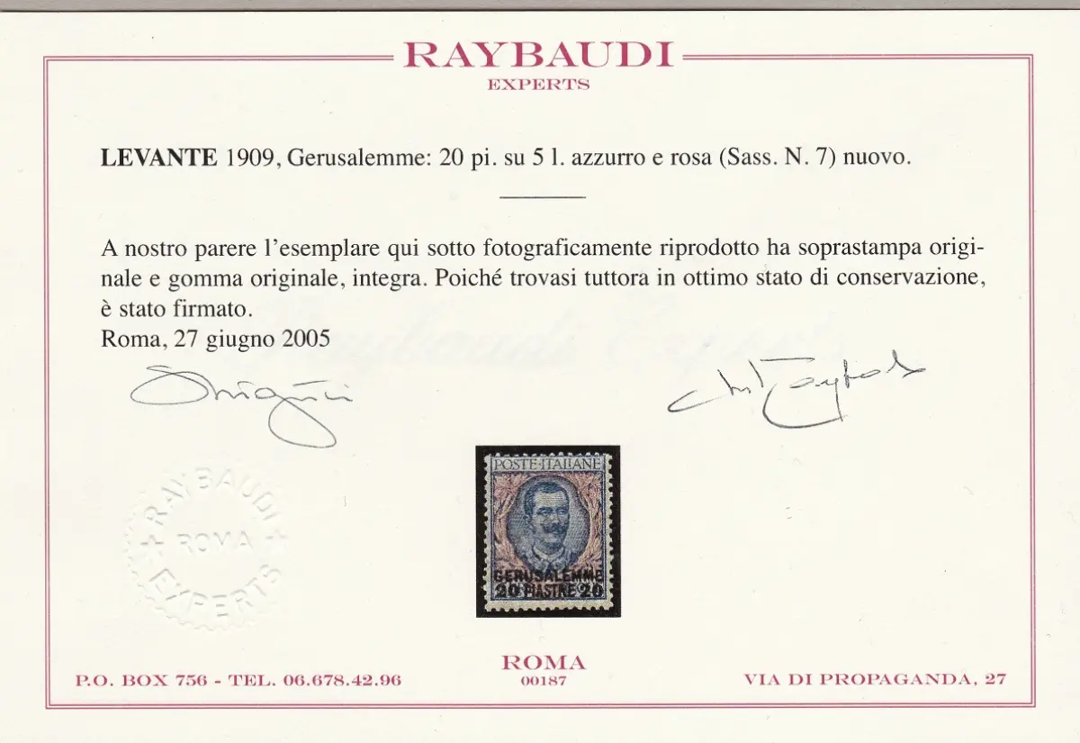 1909-11 JERUSALEM, Nr. 1/5+7 20 Platten auf 5 Lire MNH ** Raybaudi Zertifikat