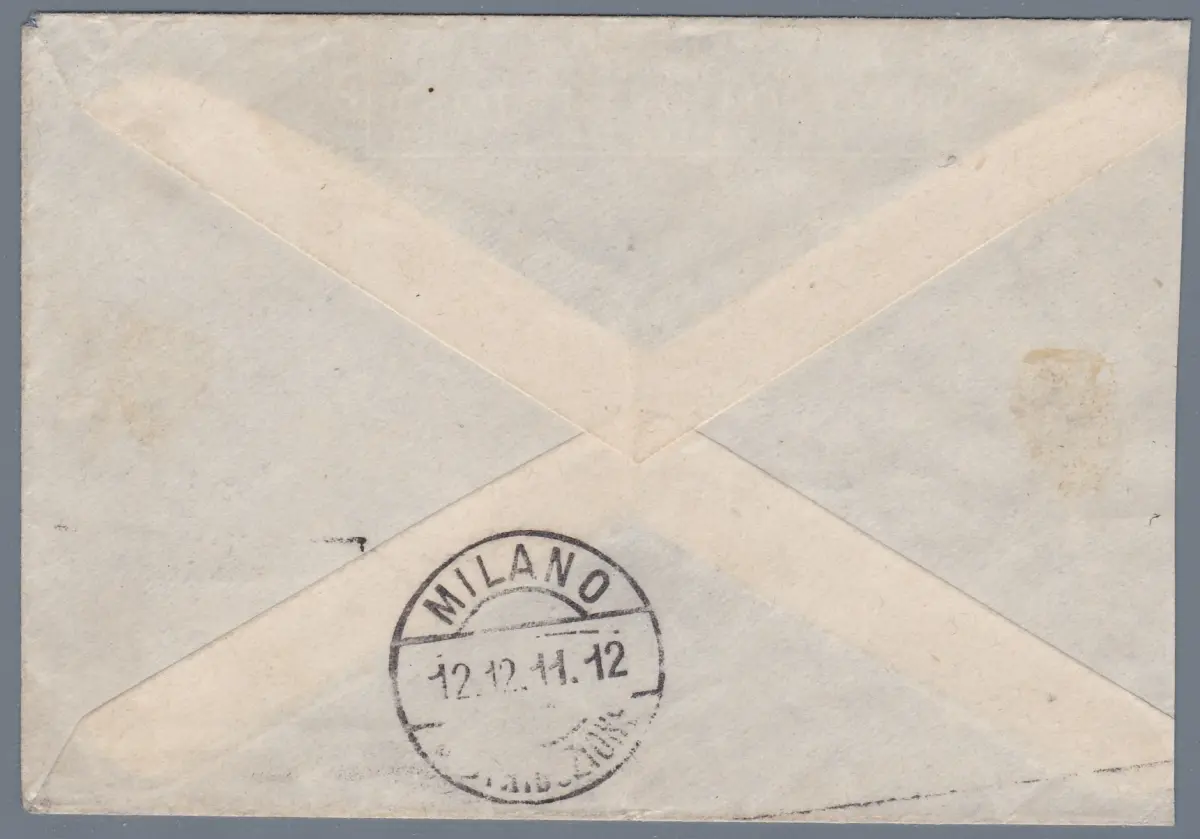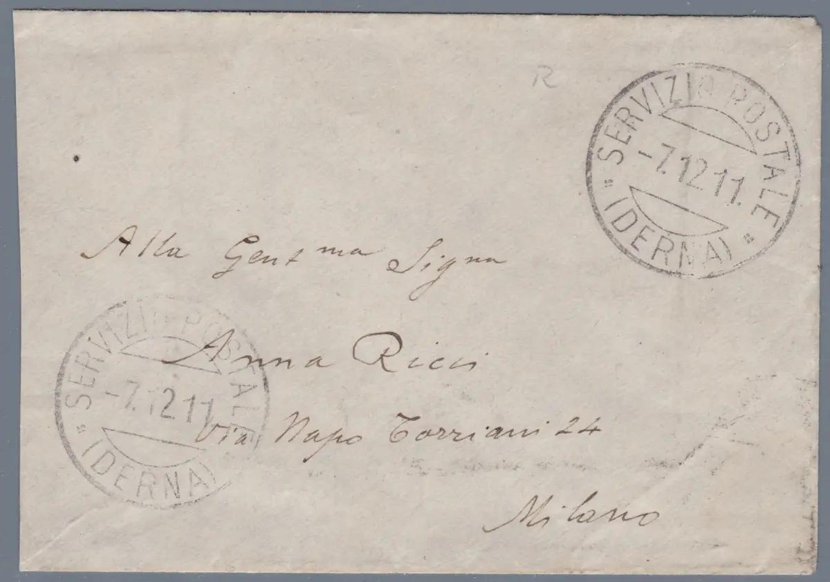 1911 LIBYEN - Reisebrief vom 7.12.1911 (eines der bekannten Daten) von Derna nach Mailand mit der seltenen Annullierung TYP 1 (Punkte 12 Euro 600) Das Postamt von Derna befand sich im Hafen der Kyrenaika etwa 300 km entfernt. aus Bengasi wurde im Dezember 1911 eröffnet und war ein 'Telegraphisches Hauptpostamt'.