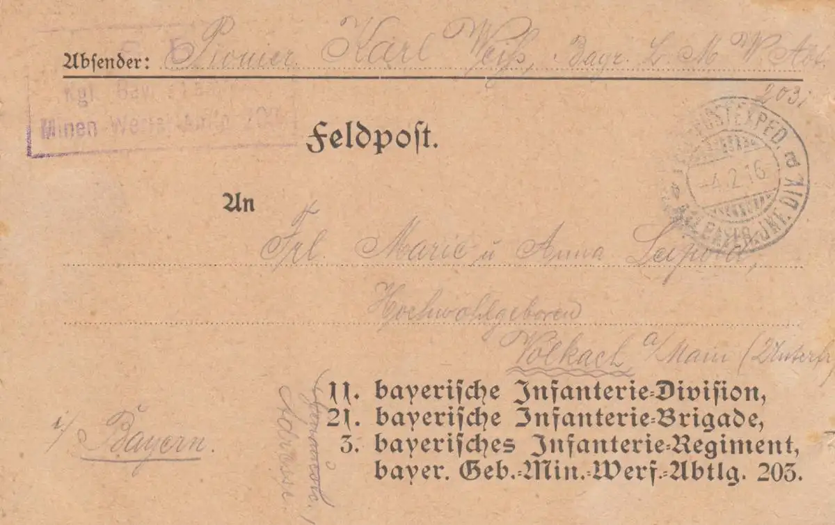 1916: Feldpost Karte an bayrische Infanterie Div/Brigade/Regiment, Minen-Werfer