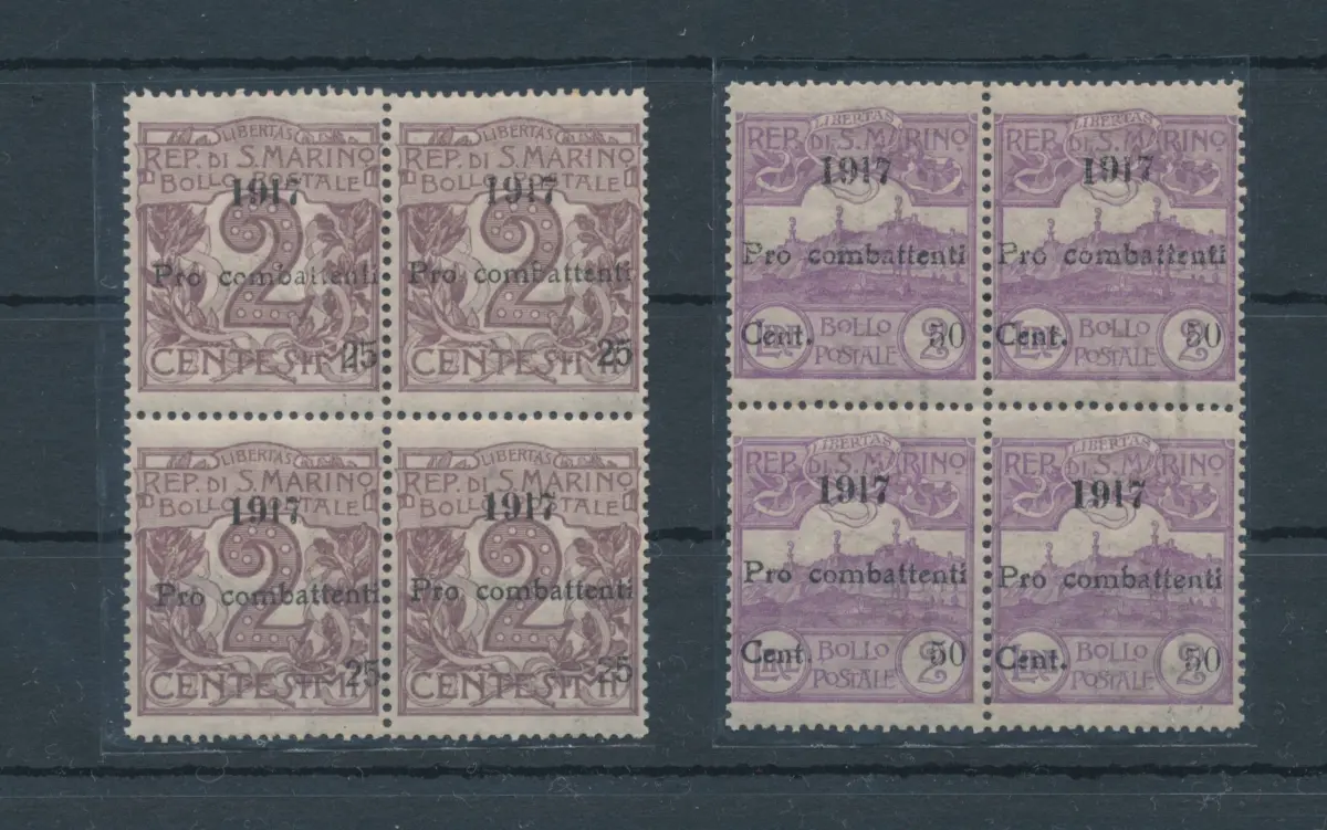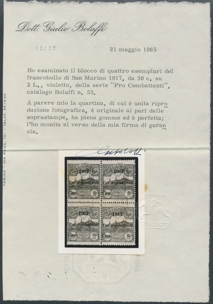 1917 San Marino, Pro Combattenti, Nr. 51/52, Quartina Certificate Historico Giulio Bolaffi, MNH ** Einheitlicher Katalog Euro 1000 + + Rote Box Ausland Lot Claudio