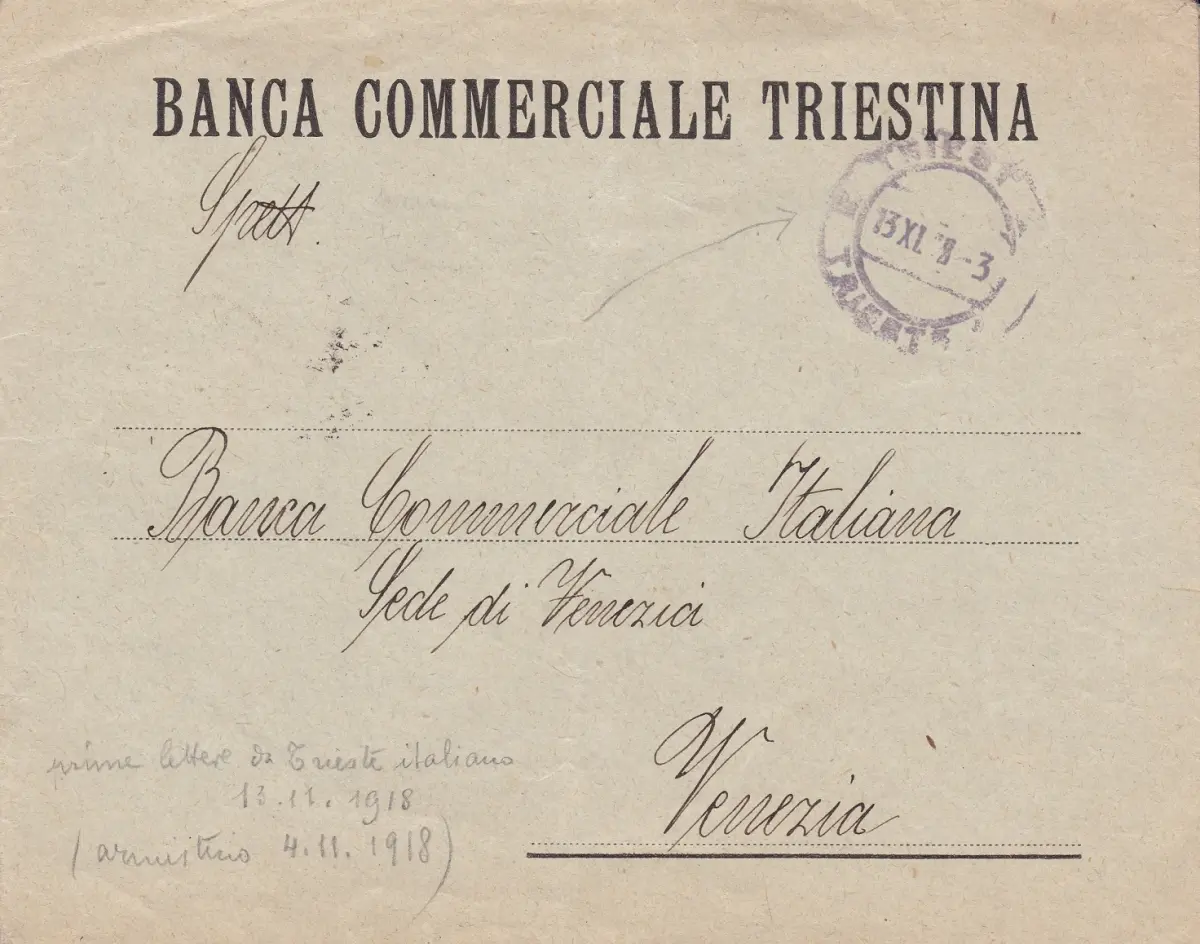 1918 TRIEST, Brief der TRIESTINISCHEN HANDELSBANK von Triest an den Sitz der italienischen Handelsbank in Venedig, der in den ersten Tagen der italienischen Besatzung (13. November) verschickt wurde.