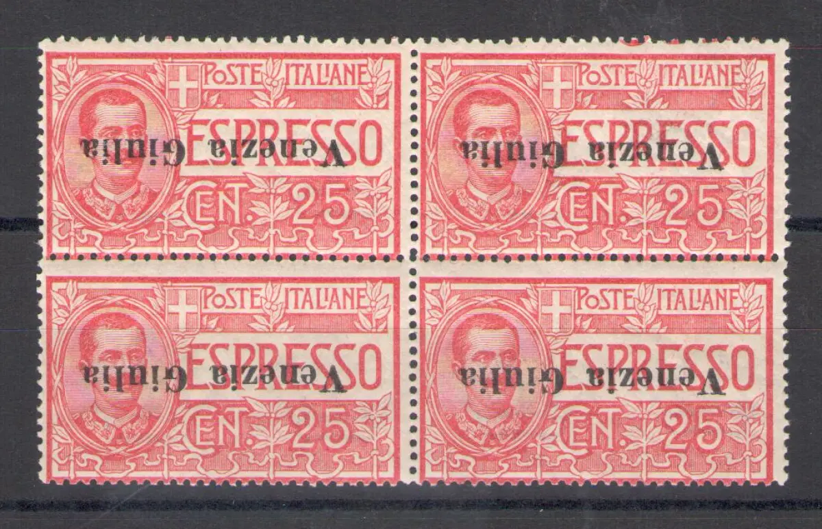 1919 Venezia Giulia - Espresso n. 1. AUFDRUCK UMGEDREHT - WUNDERSCHÖN Quartina MNH ** Sächsischer Katalog Euro 7200 Album braun Triest A/B