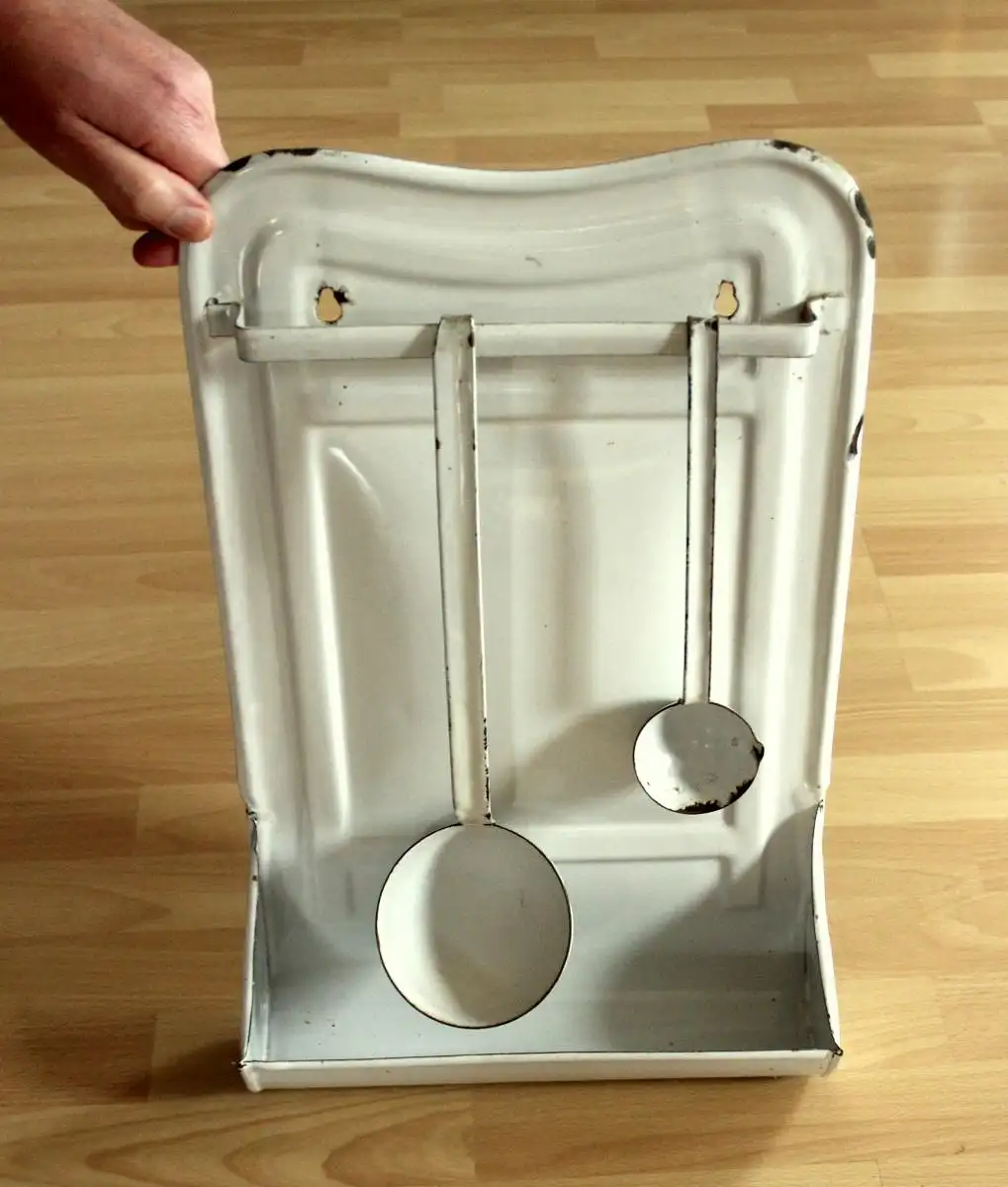 Original Kellenhalter komplett aus Metall emailliert. Mit 2 Schöpfkellen. Ein Schätzchen aus den 1920er Jahren. Ein schöner Blickfang in Haus und Küche. In gutem Vintage Zustand mit altersgerechten Gebrauchsspuren - siehe Fotos. Rarität.