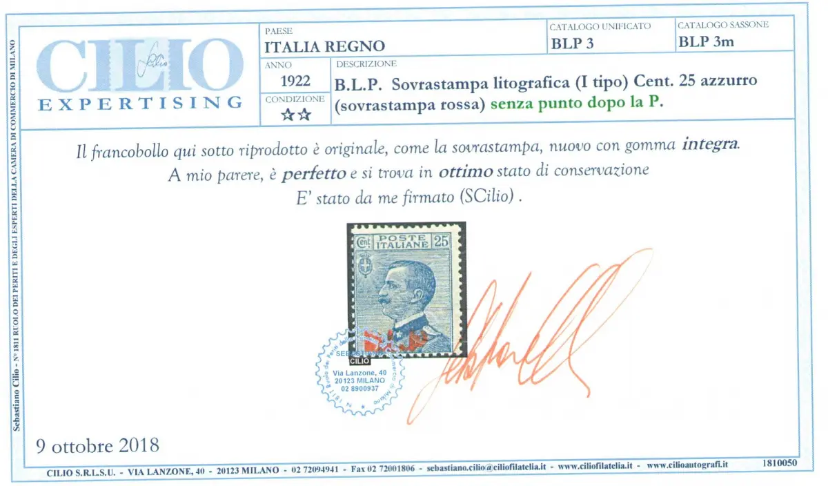 1921 Königreich Italien BLP 10 Cent rosa ohne Punkt nach P Nr. 3m MNH ** Zertifikat Cilio