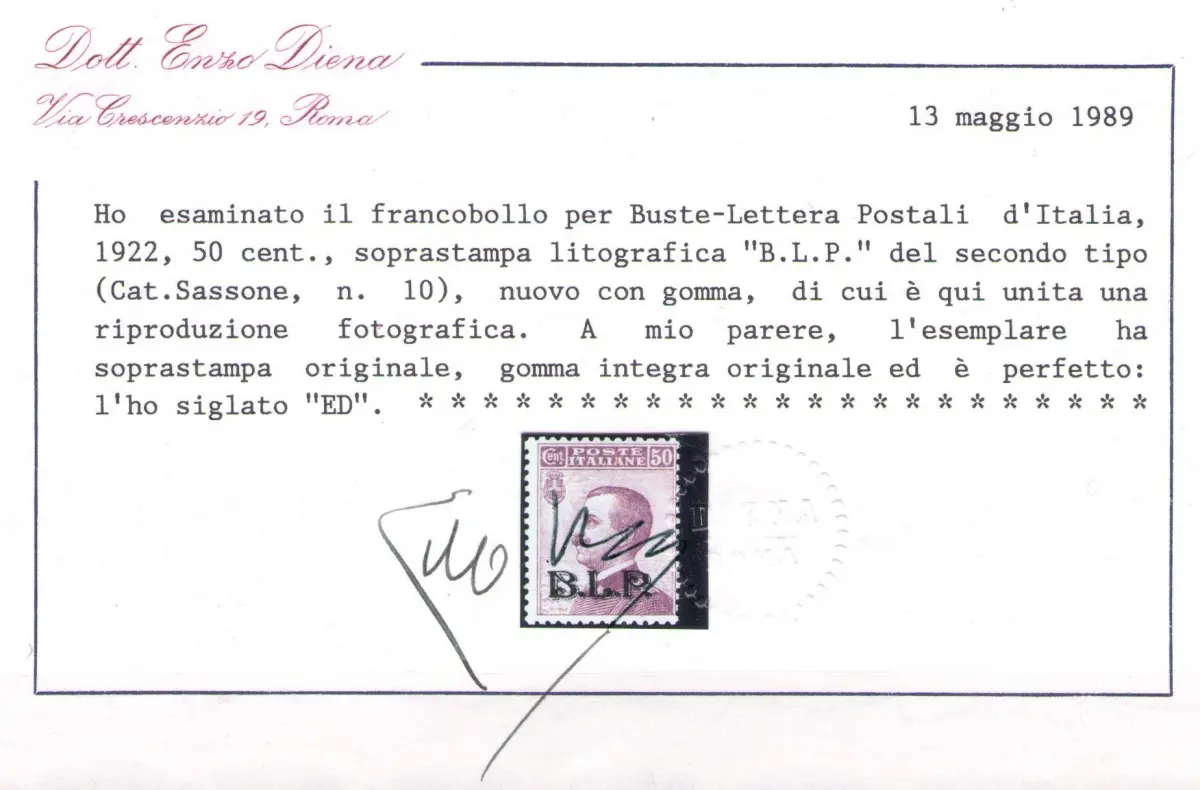 1922-23 Königreich Italien, BLP Nr. 10, 50 Cent. violett, Aufdruck II TYP, gute Zentrierung, postfrisch** - Zertifikat Enzo Diena Vollgummi und Original - ohne Linguella - Not Hinged Lot Claudio Sächsischer Katalog Nr. 2500