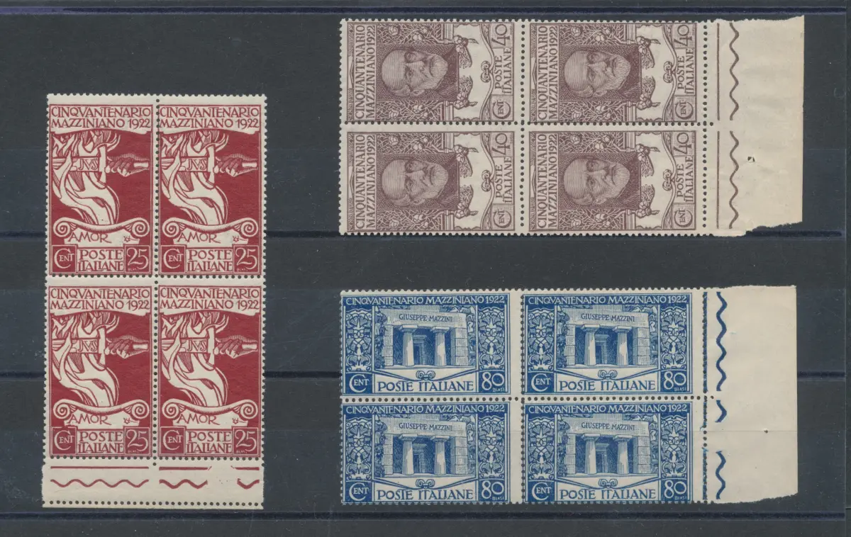 1922 Italien - Königreich, 50. Todestag von Giuseppe Mazzini Nr. 128/130, 3er-Wert-Serie, Viererblock, postfrisch ** Sächsischer Euro-Katalog 800 - weißer Hauskasten + roter Königreichskarton