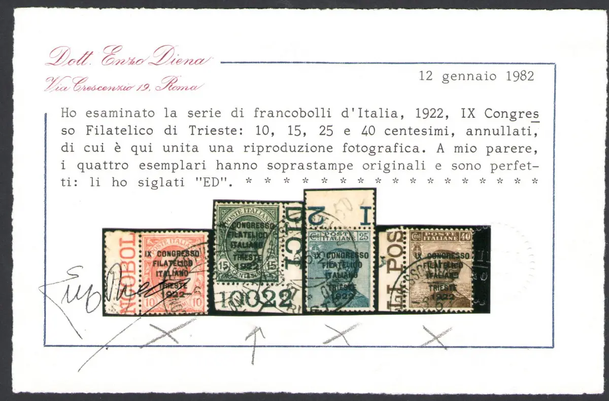 1922 Italien Königreich Italienischer Philatelistischer Kongress Triest 15 Cent grau, Nr. 124 SELTENE gebrauchte Tafelnummer, historisches Zertifikat Enzo Diena und Unterschrift in Richtung Alberto Diena.
