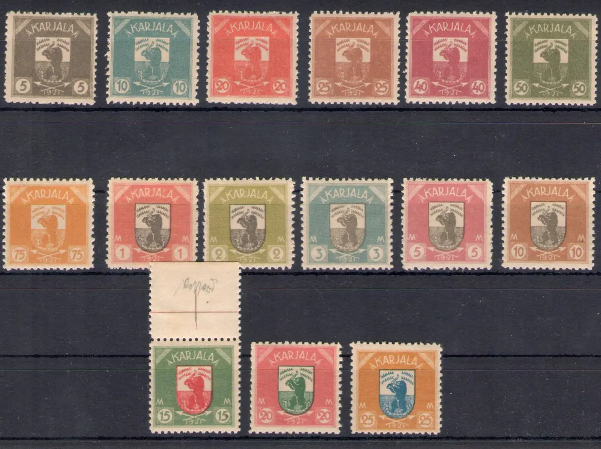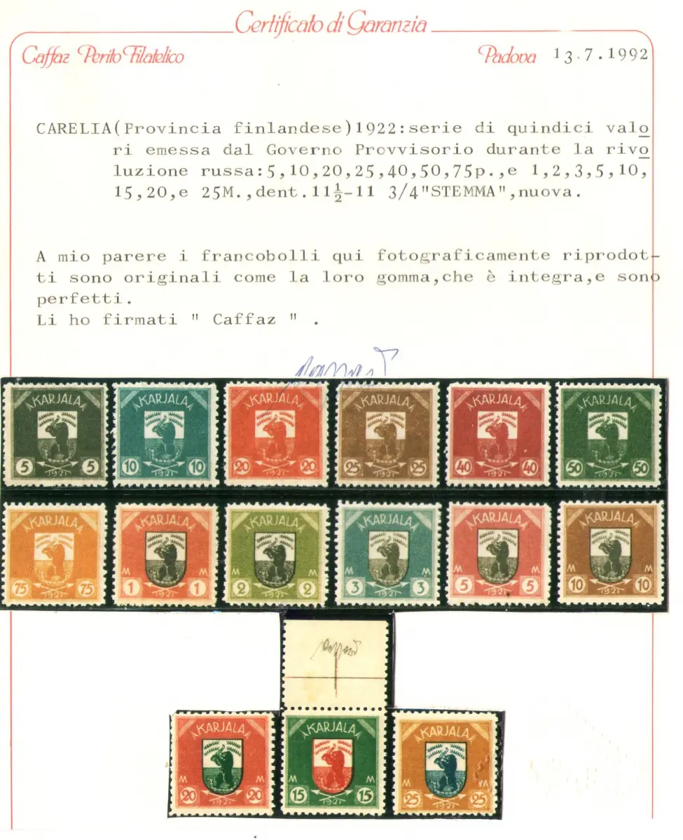 1922 Karjala Finnland - Nr. 1-15, Serie von 15 Werten, herausgegeben von der Provisorischen Regierung während der Russischen Revolution - MNH ** - Karelien Katalog Nr. 1/15 Euro 500 Yvert und Tellier Auslandskarton rot am Ende