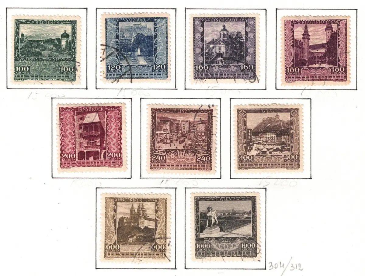 1923 ÖSTERREICH, Nr. 304/12 Österreichische Stadtansichten, komplette Serie gebraucht Einheitskatalog Euro 120 - Lot 50/1
