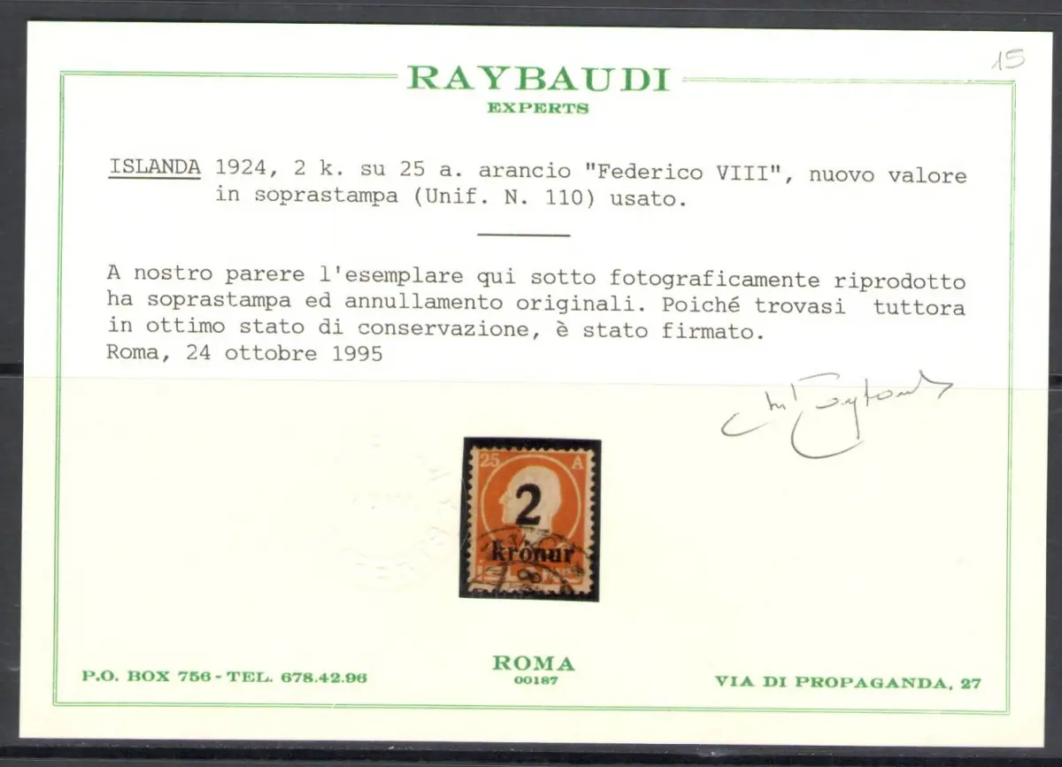 1924-26 Island, Nr. 110 - 2 k. auf 25 v. Chr. - Gebrauchtes Raybaudi Zertifikat Einheitskatalog Euro 150 - grüne Box Ausland
