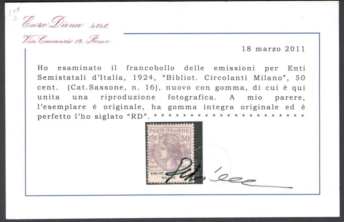 1924 Italien, halbstaatliche Körperschaften, komplette Serie 13/16, 4 Werte, Umlaufbibliotheken Mailand, MNH ** - Zertifikat Diena - Vollgummi und Original - Ohne Sprache Einheitlicher / Sächsischer Katalog - Euro 5200 Lot Königreich Claudius