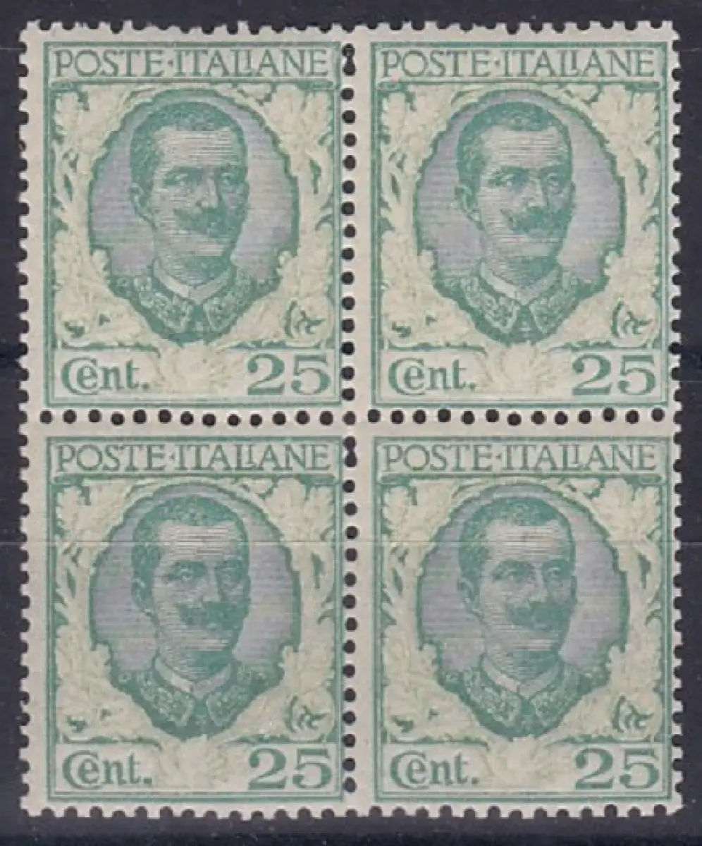 1926 Italien - Königreich - Nr. 200c Block von 4 MNH / ** modifizierter floraler Typ, 25c. grün und olivgrün OHNE VERZIERTEN DRUCK Sächsischer Katalog Euro 120 VOLLGUMMI MAX