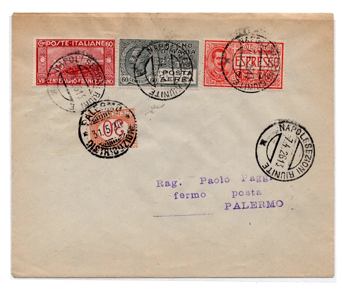 Umschlag - 1926 Neapel/Palermo vom 7. April - Weitergeleitetes Aerogramm mit Jungfernflug SANA - besteuerter Umschlag in Palermo Cent. 30 per Postanschlag (Kat.Sass. n. 59b, Longhi Nr. 1471) - Uncommon - Kat. euro 300 Cod. 75/17