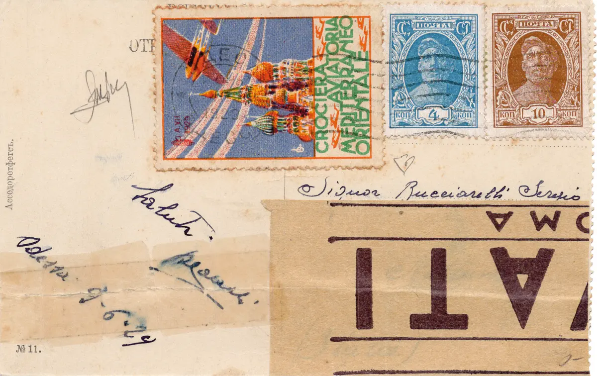 Briefumschlag - 1929 Mittelmeerkreuzfahrt - Postkarte aus Odessa direkt nach Italien frankiert mit zwei Briefmarken der Sowjetunion, neben denen die Erinnerungsvignette an die von der Briefmarke betroffene östliche Mittelmeerluftfahrt angebracht ist - Die defekte Postkarte (geschnitten und mit Papier zusammengefügt), aber Briefmarken und Vignette sind perfekt (Kat. Sass. n. GP 19d, Longhi n. 1910) - Cert. ED - Kat. euro 1.000 Cod. 88/17
