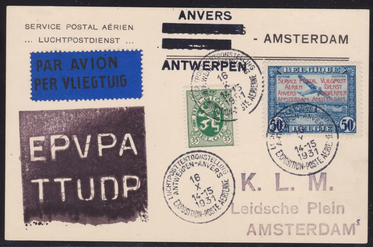 1931 Belgien - PR32 Luftpostdienst ANTWERPEN - AMSTERDAM Postkarten Ausstellung Luftpost - Luftpostmarke Nr. 1, zweisprachiger Aufdruck Katalog COB Euro A/M Lot 96