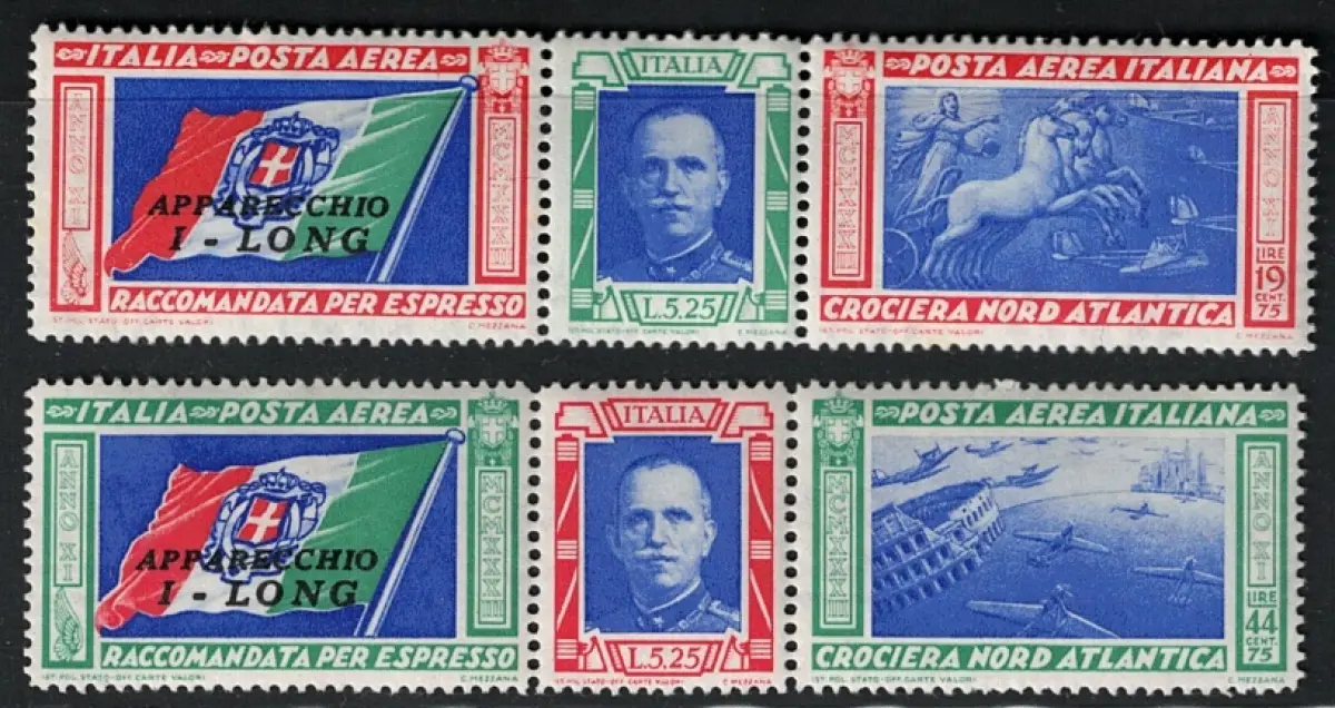 1933 Italien, Königreich, Luftpost, # 51I/52I, Tripttici Long, MNH** 1933 Nordatlantik-Luftkreuzfahrt 1. Juli 12. August 1933 Die Luftkreuzfahrt des Jahrzehnts, oder Nordatlantikkreuzfahrt, oder auch 'Nordatlantik-Luftkreuzfahrt', auch bekannt als Luftkreuzfahrt 'Italien-Nordamerika', 'Orbetello-Chicago-New York-Rom' oder 'II Atlantikkreuzfahrt 1933, war die die zweite und letzte Transatlantikkreuzfahrt 1933 war.