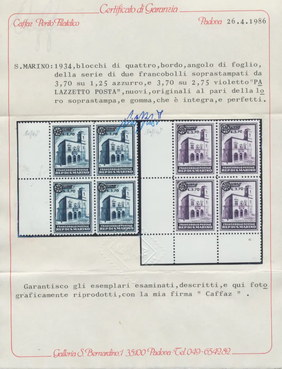 1934 San Marino, Postpalast überdruckt, Nr. 184/85, postfrisch ** Rand und Bogenwinkel - Garantiezertifikat Caffaz Sächsischer Katalog 2022 Euro 2250 Lot Claudio Auslandskarton