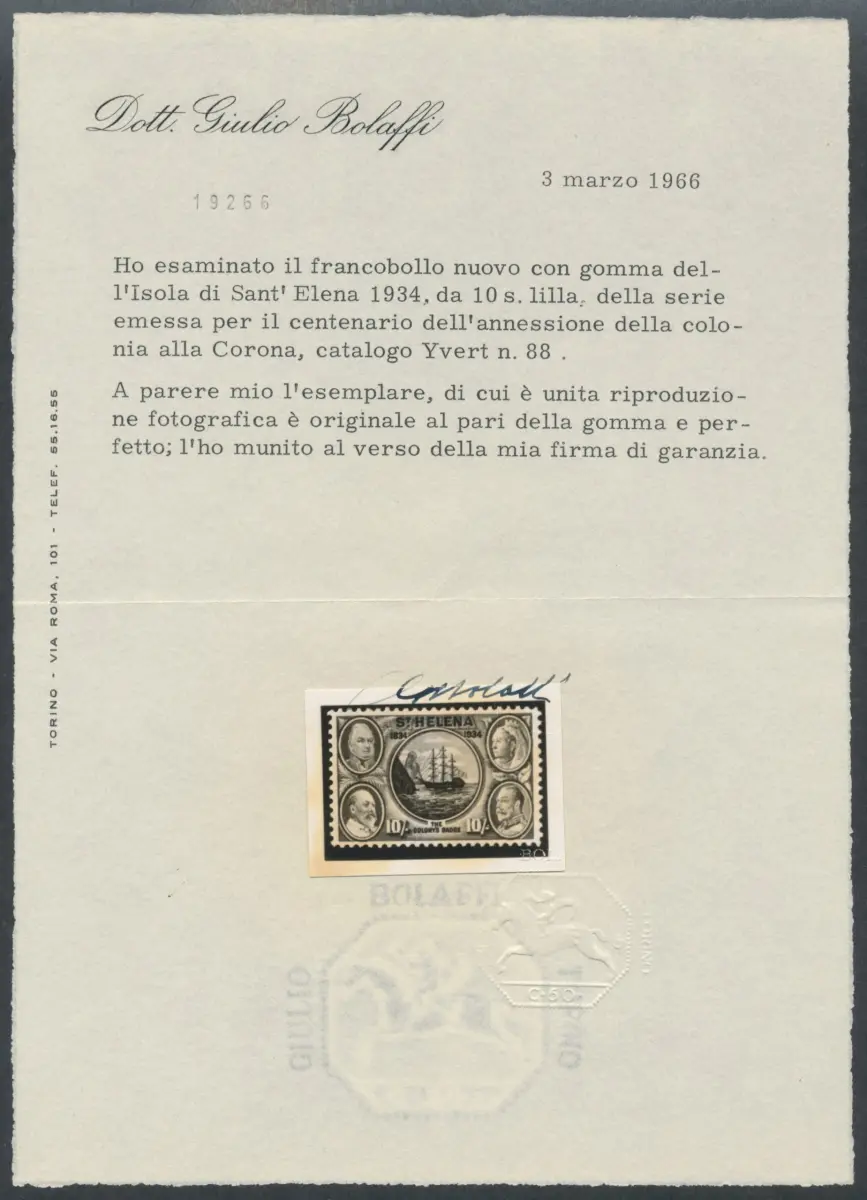 1934 St. Helena, Stanley Gibbons n. 114/23 - MLH* - Bolaffi Zertifikat für den hohen Stanley Gibbons Wert £ 475 - Lot Kolonien Album Rot