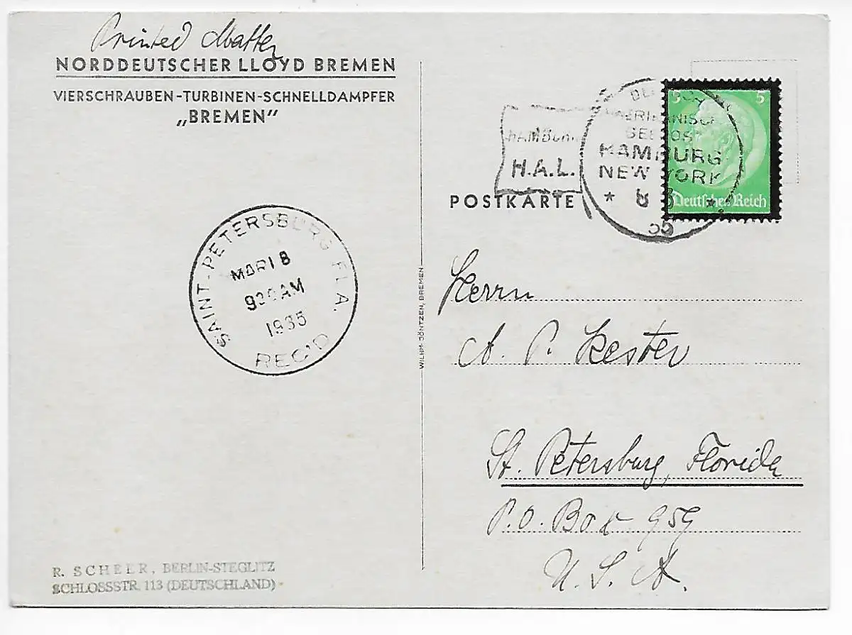 1935: Ansichtskarte Norddeutscher Lloyd Bremen, Schiffspost nach St. Petersburg