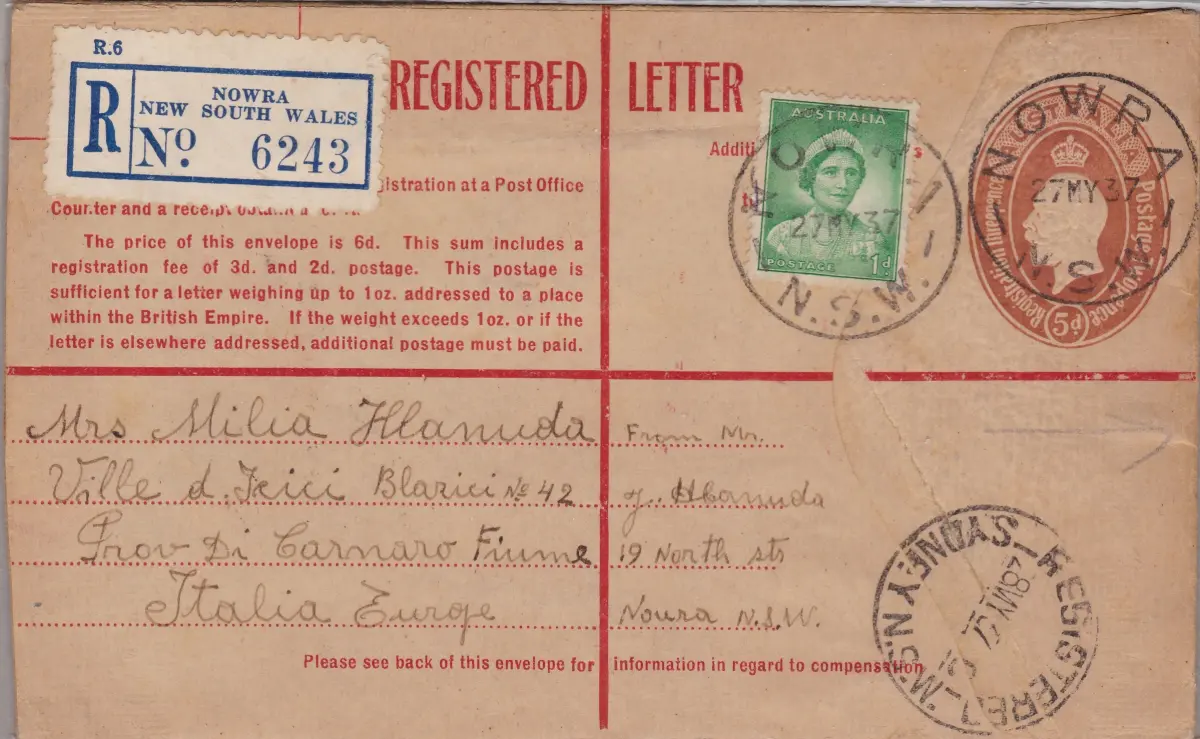 1937 AUSTRALIEN - 5d. braun von NOWRA NSW nach Ville d'Icici (Fluss - Italien), seltenes Ziel A/M Lot 90