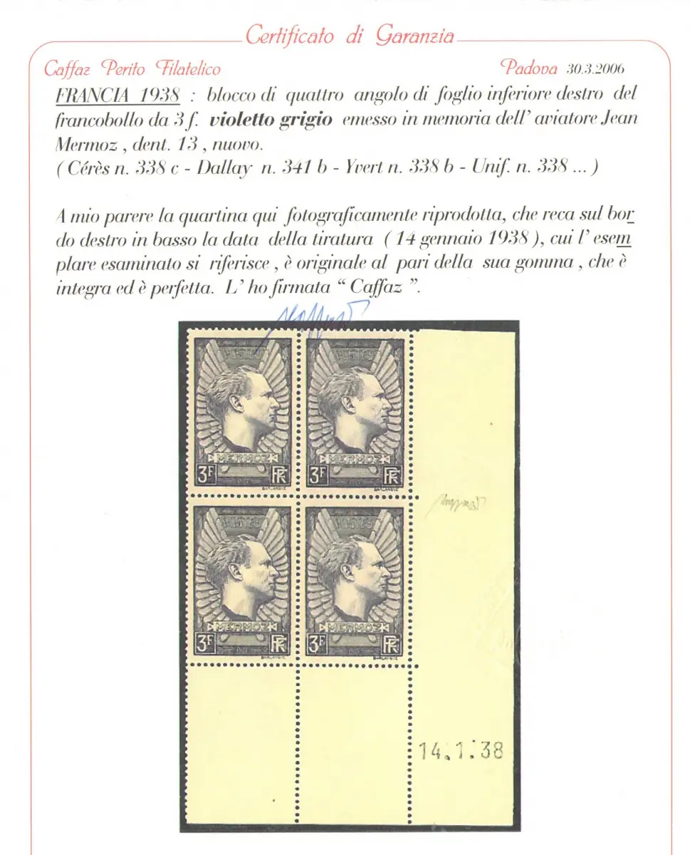 1937 FRANKREICH - Flieger Jean Mermoz Nr. 338b Maury-Katalog 1 Val, Quartina Coin dateè (14-01-1938) MNH **, Original- und Vollgummi, WUNDERSCHÖNE QUALITÄT SEHR GUTE QUALITÄT Einheitskatalog Euro 1800 Maury-Katalog Euro 1700 Katalog Dallay Euro 2.000 Ref: Auslandsbox A / FR