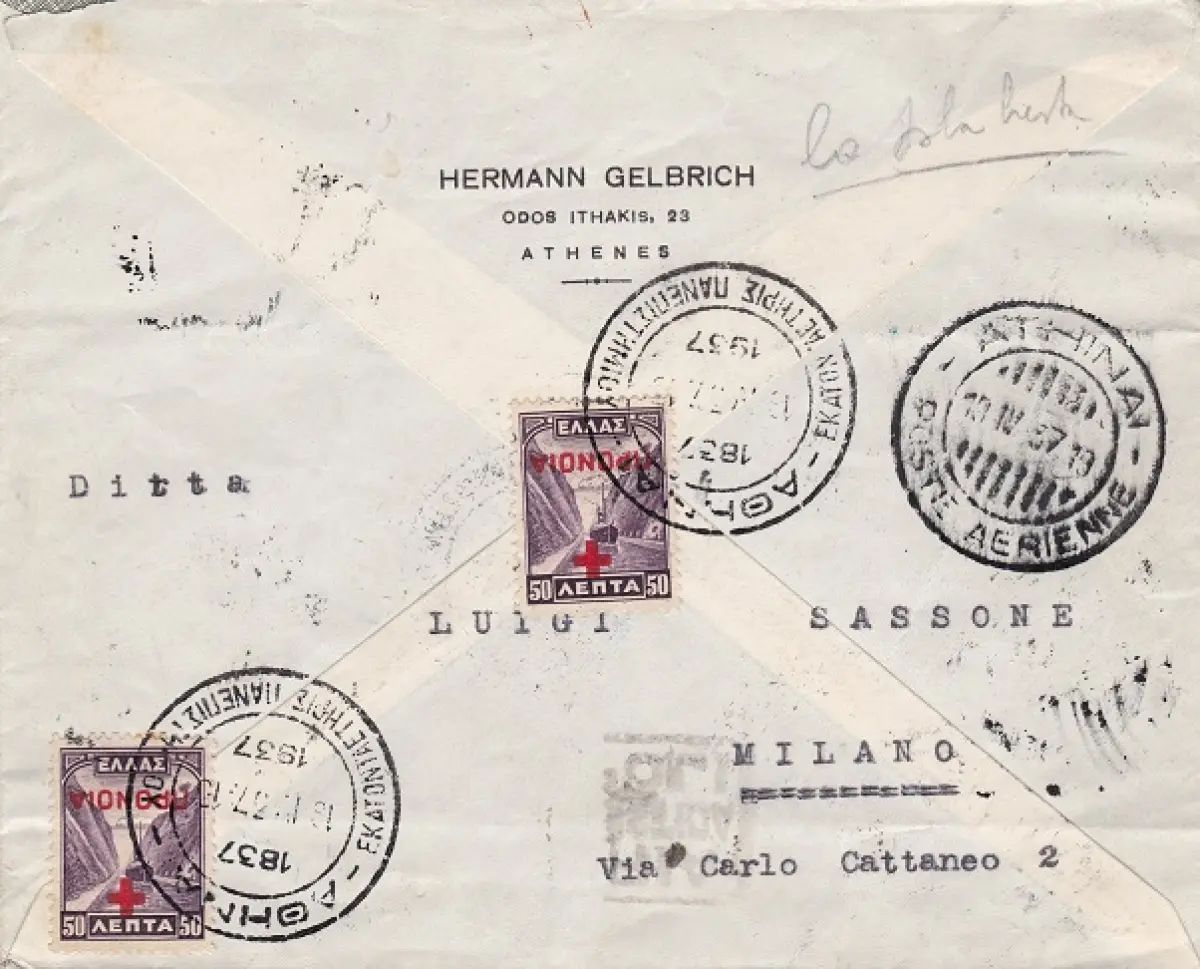 1937 GRIECHENLAND Nr. 421 3d. braun gelb vierteljährig auf Brief nach Mailand (Posta Aerea)