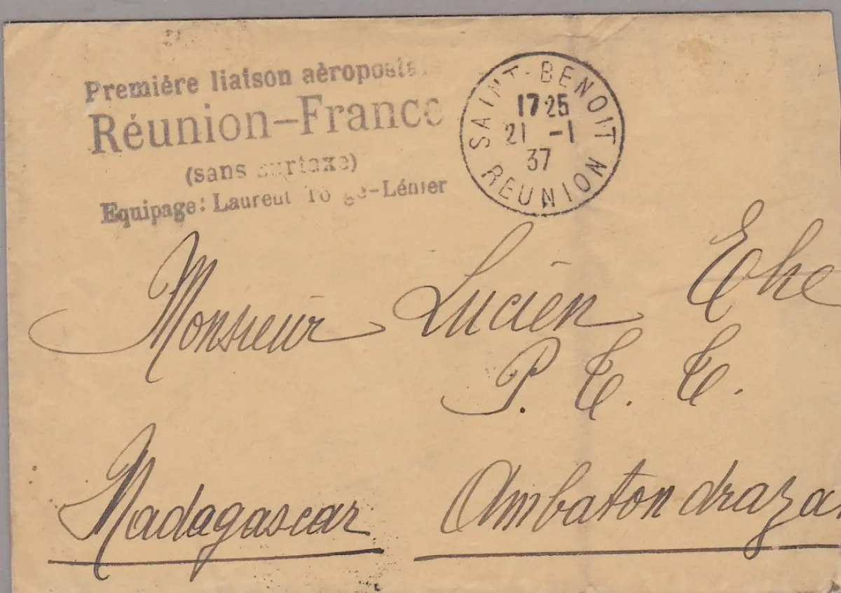 1937 REUNION, Yvert PA Nr. 1 Courrier d'escales au depart de la R union CS sur 4 lines Signatur E. Diena Corriere R Union-Frankreich via Madagascar durchgeführt mit dem Flugzeug ROLAND GARROS Besatzung Laurent-Touge-Lenier Lotto 108